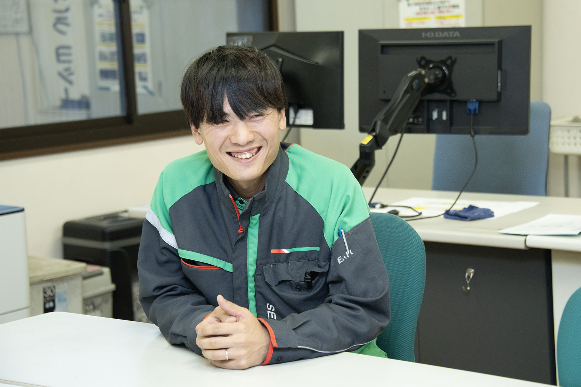 現在はフォークリフトを使う仕事が中心です。パレットに並んだ製品を倉庫へ収納したり、出荷の準備をしたり、大型トラックへ積み込んだりと、工場の中で物流を動かす役割を任されています。特に大型トラックへの積み込みは、お客さまに届くまでの最後の工程のため、責任の重さを強く感じる場面でもあります。予定通りに安全に、見た目もきれいに積み込めた時は、達成感があります。当所は、社員同士で協力しながら作業を進めていく雰囲気があります。仕事をしていると、周りの意見を聞く機会が自然と増えてきて、チームで動くことの大切さを実感することが多いです。いずれは、自分が周りをまとめられるような存在になりたいと思っています。